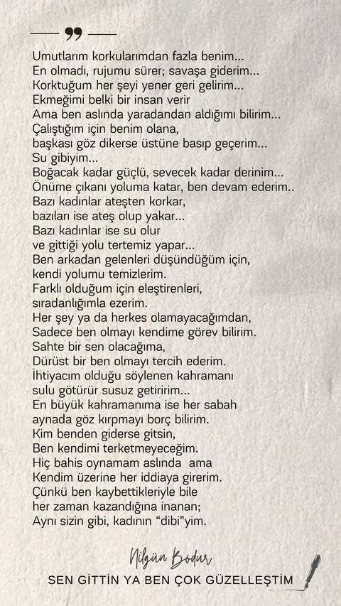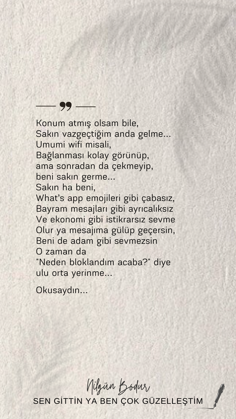 "SEN GİTTİN YA BEN ÇOK GÜZELLEŞTİM" Nilgün Bodur'un 2. kitabıdır. Web sitemizin menüsünde "KİTAP" sekmesine tıklayarak Nilgün Bodur'un tüm kitapları hakkında detaylı bilgiyi ve online satış linklerini bulabilirsiniz.